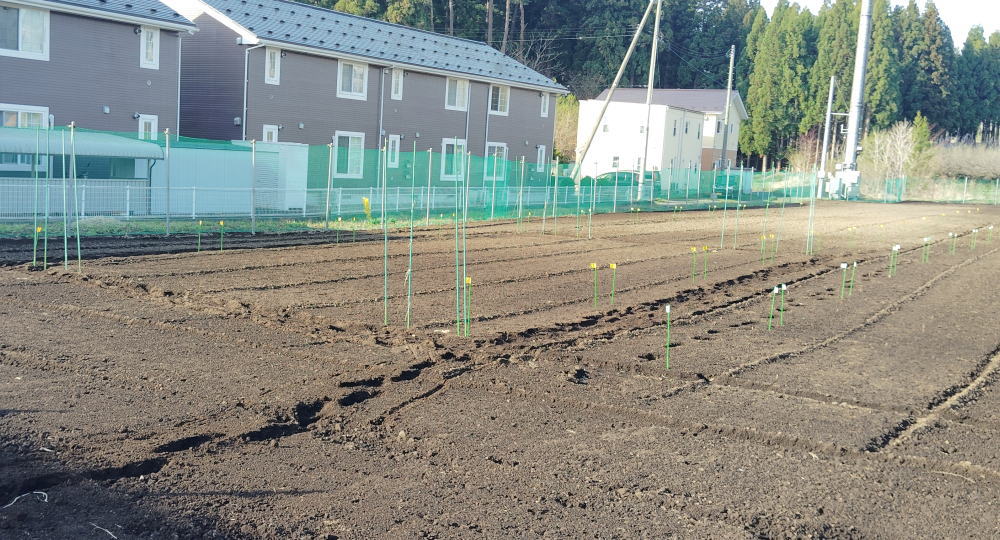 測ってみると、四辺のうち北が700cm、南が685cm、東が1350cm、西が1345cmだった。東西の差は無視出来るぐらいだけど、南北はちょっと差が大きいね。うねの幅を調整して対応することにしよう。